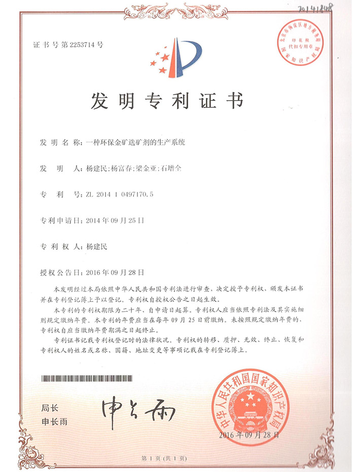 熱烈祝賀我公司又取得一項專利《一種環(huán)保金礦選礦劑的生產系統(tǒng)》